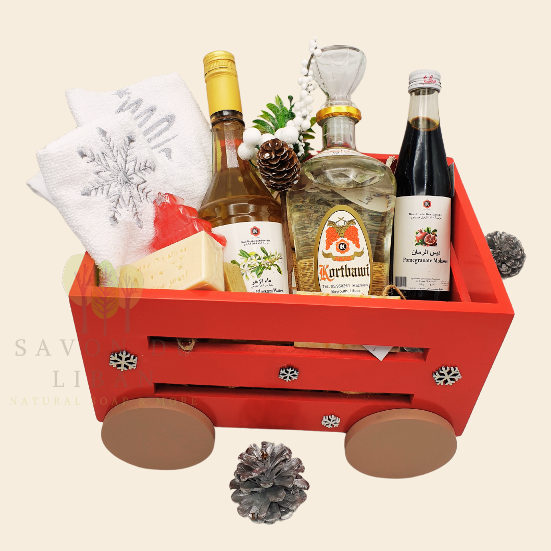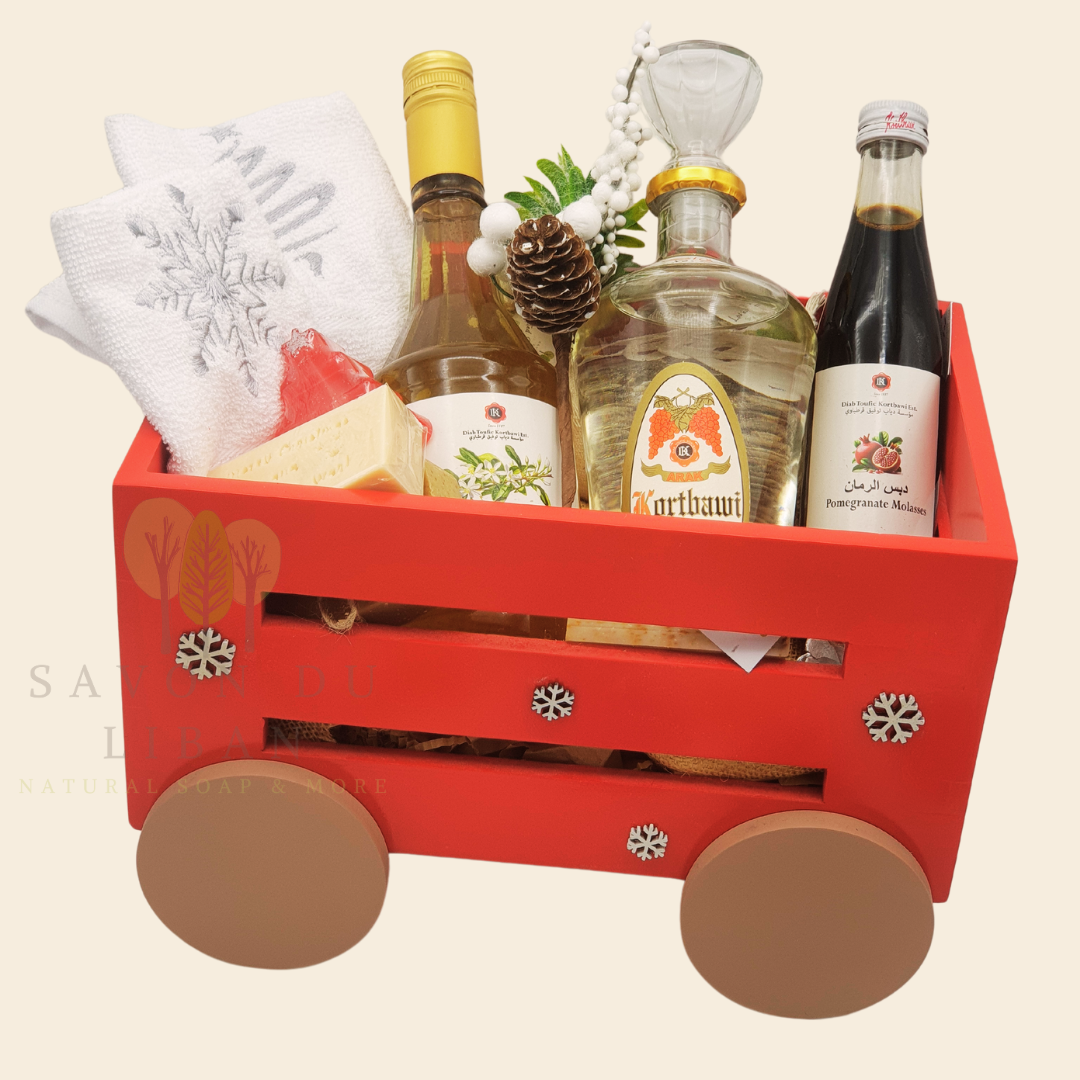 Embark on a flavorful and fragrant journey this holiday season with The Arak Express, a wooden basket on charming red wheels that combines Lebanese heritage with Christmas cheer. Thoughtfully curated, this basket is a delightful blend of culinary treasures, festive elegance, and artisanal craftsmanship.